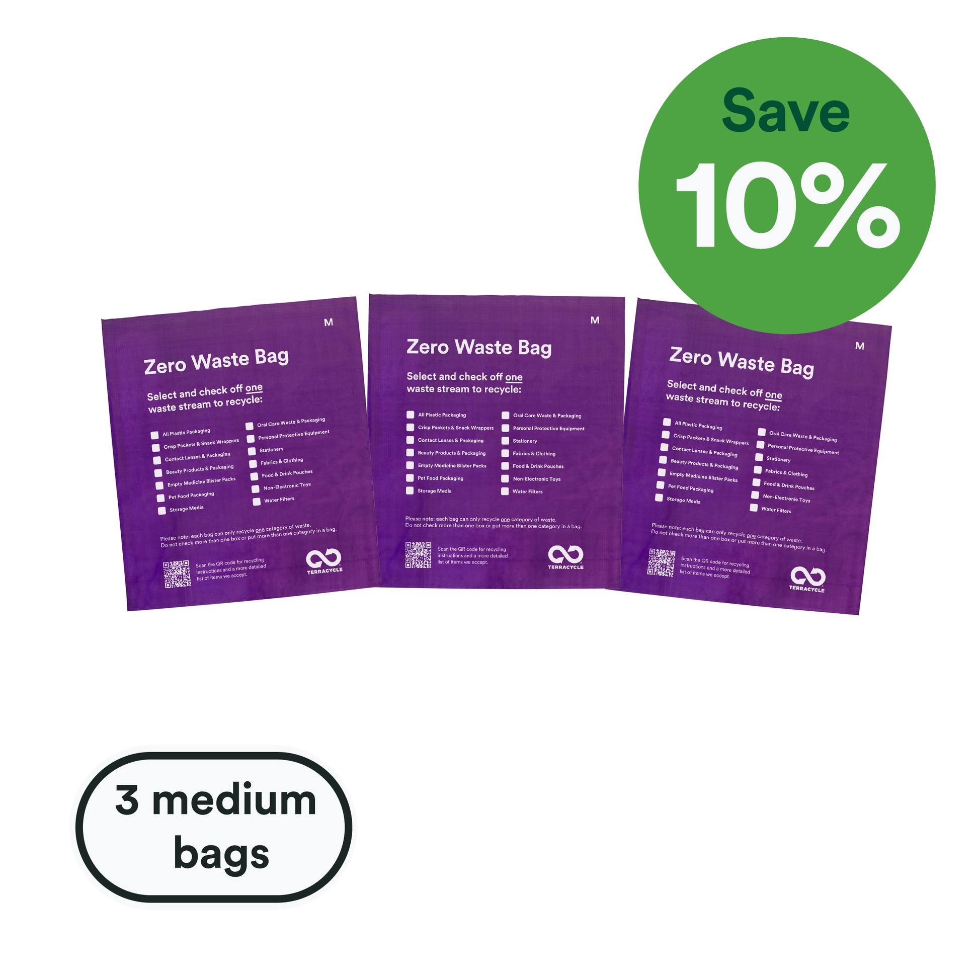 3 x Medium Zero Waste Bags (W400xH420mm, the bag expands to 40mm in the middle and each bag holds approx. 7 L of waste.)